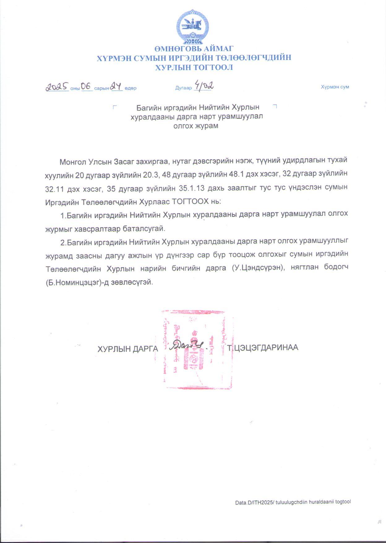 Багийн иргэдийн Нийтийн Хурлын хуралдааны дарга нарт урамшуулал олгох журам