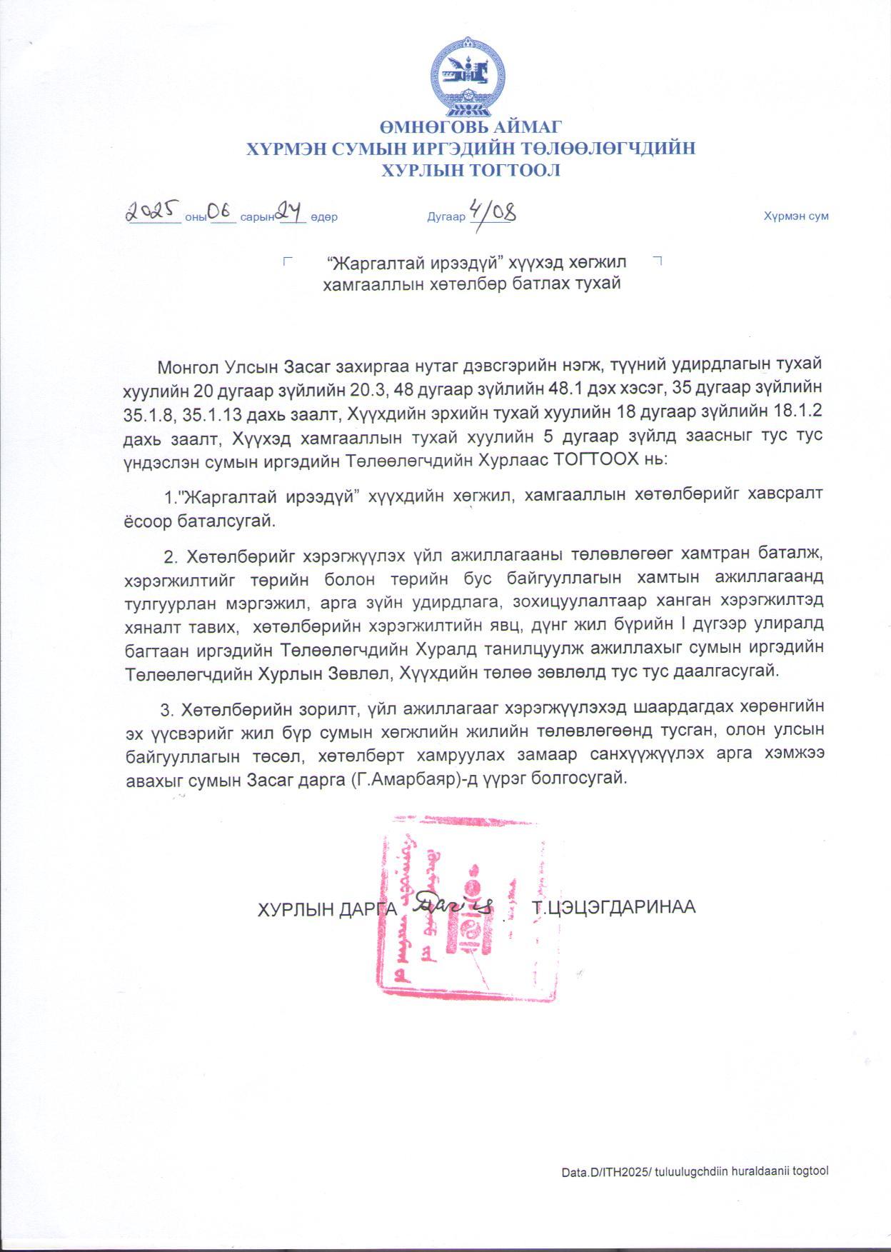 "Жаргалтай ирээдүй" хүүхэд хөгжил хамгааллын хөтөлбөр батлах тухай