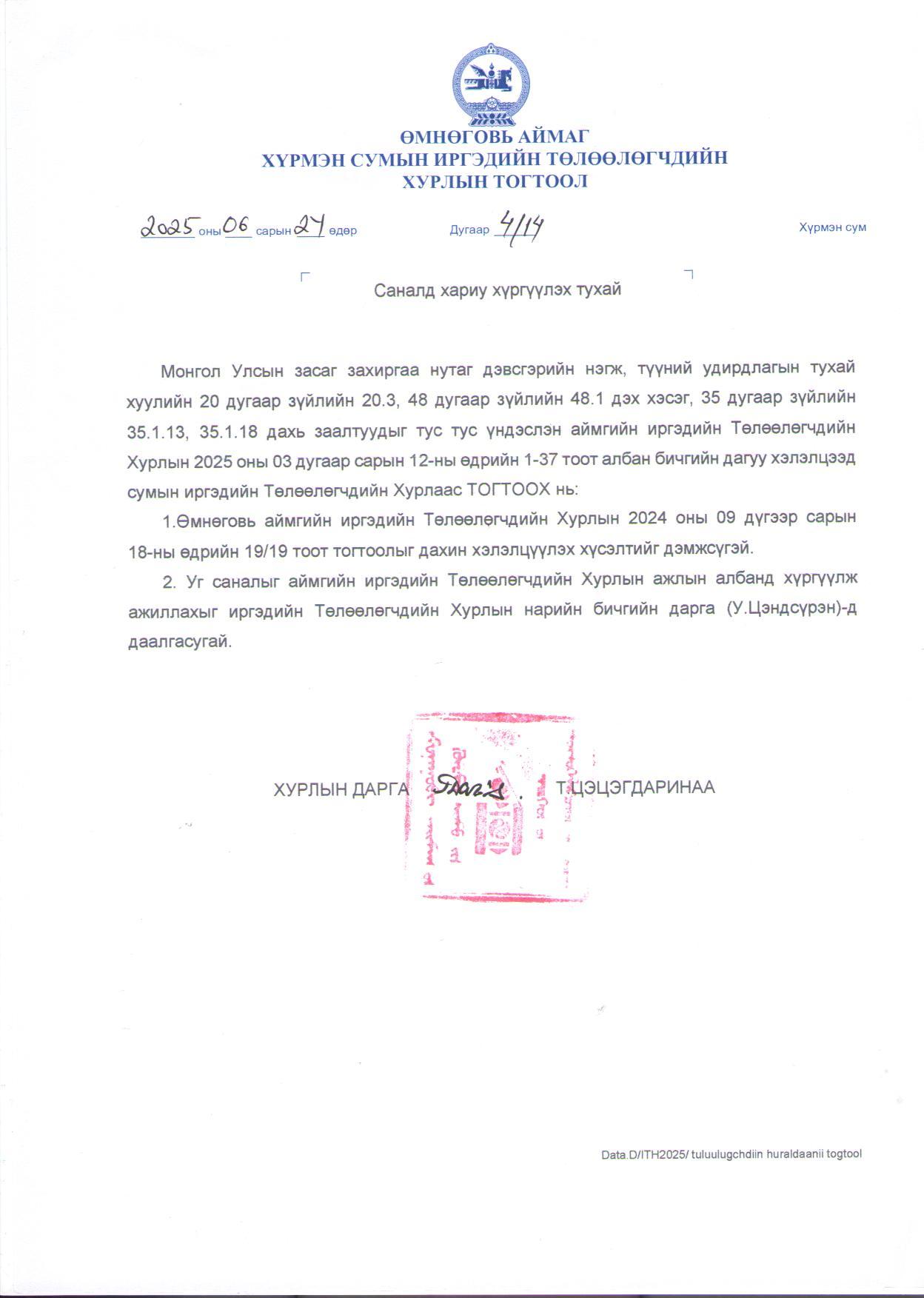 Хурлын даргын захирамж